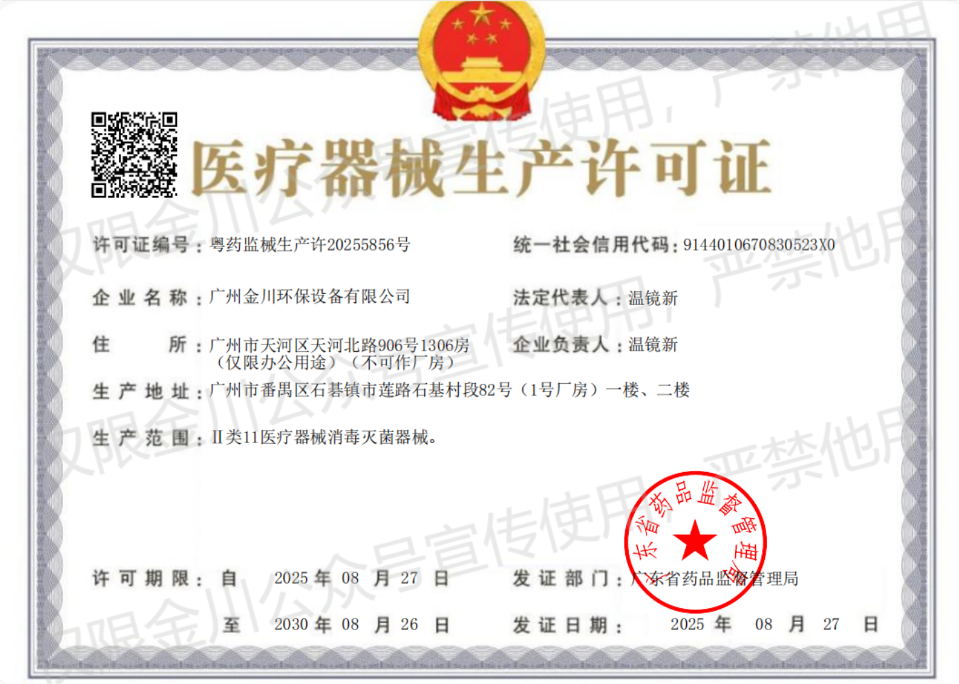 近日,廣州金川環保設備有限公司正式獲得廣東省藥品監督管理局頒發的: